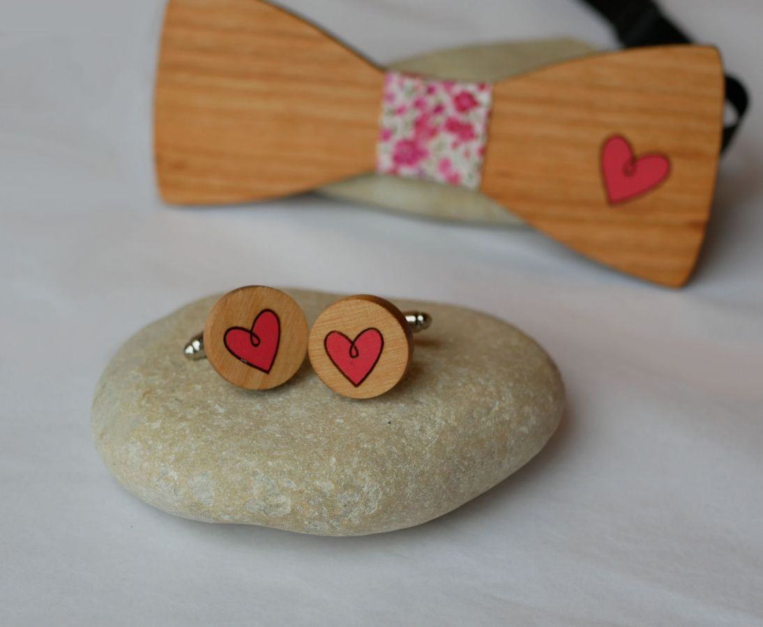 Punho redondo de madeira com desenho de coração gravado e pintado na cor da sua escolha. Pode também escolher o acabamento de madeira: natural, linho, cor de cerejeira ou nogueira. Assim, os botões de punho podem ser perfeitamente ajustados aos