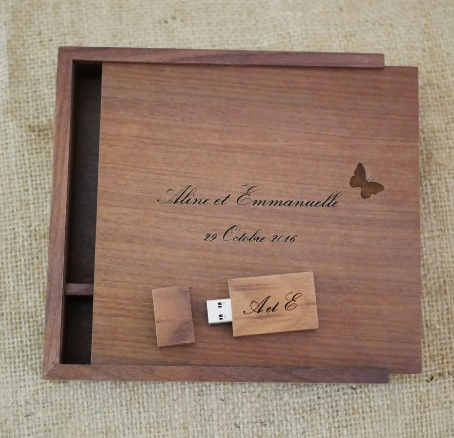 Uma ideia de presente única para personalizar, uma bela apresentação para fotos físicas e electrónicas! Uma bela pen drive USB em madeira de nogueira escura que pode ser gravada com um primeiro nome ou uma palavra doce com a sua caixa de madeira maciça correspondente que também pode ser gravada com uma mensagem. A caixa pode também conter 10 x 15 fotografias.