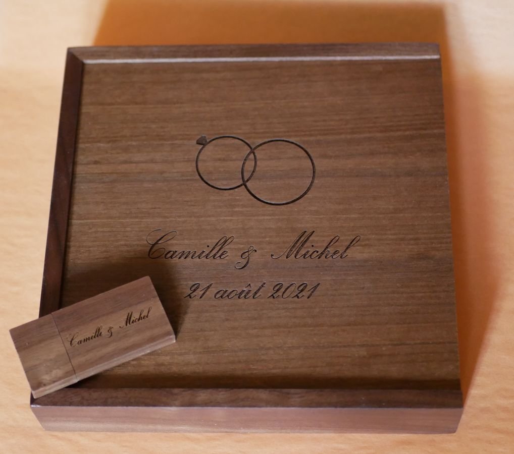 Para oferecer fotos de um belo evento (presente de casamento, um belo aniversário...) ou música, a memória USB e a sua caixa são um suporte ideal para personalizar.